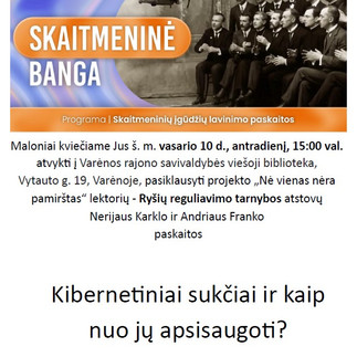 Varėnos viešoji biblioteka taip pat tiesiogiai transliuos „Skaitmeninės bangos“ renginį, o 15:00 val. pakvies visus vietos gyventojus į susitikimą su Ryšių reguliavimo tarnybos specialistais Nerijumi Karklu ir Andriumi Franku, kurie skaitys paskaitą „Kibernetiniai sukčiai ir kaip nuo jų apsisaugoti?“